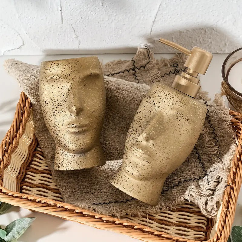 Zestaw dwóch ceramicznych akcesoriów łazienkowych. Zestaw zawiera dozownik do mydła i uchwyt na szczoteczki do zębów. Oba elementy mają kształt ludzkiej twarzy.