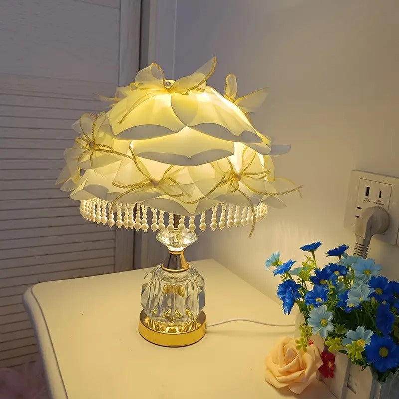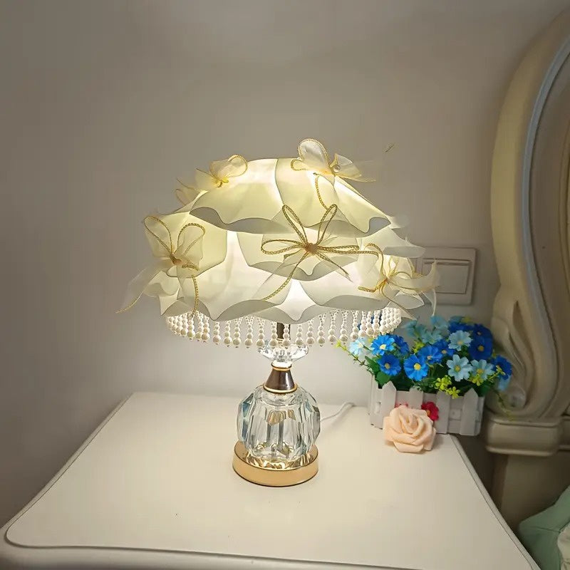 Ta dekoracyjna lampa do sypialni posiada wielościenną kryształową podstawę osadzoną na stojaku. Lampa ma klosz ozdobiony małymi kokardkami rozmieszczonymi na jego powierzchni. Wzdłuż dolnej krawędzi klosza zawieszony jest frędzel z małych, okrągłych koralików.