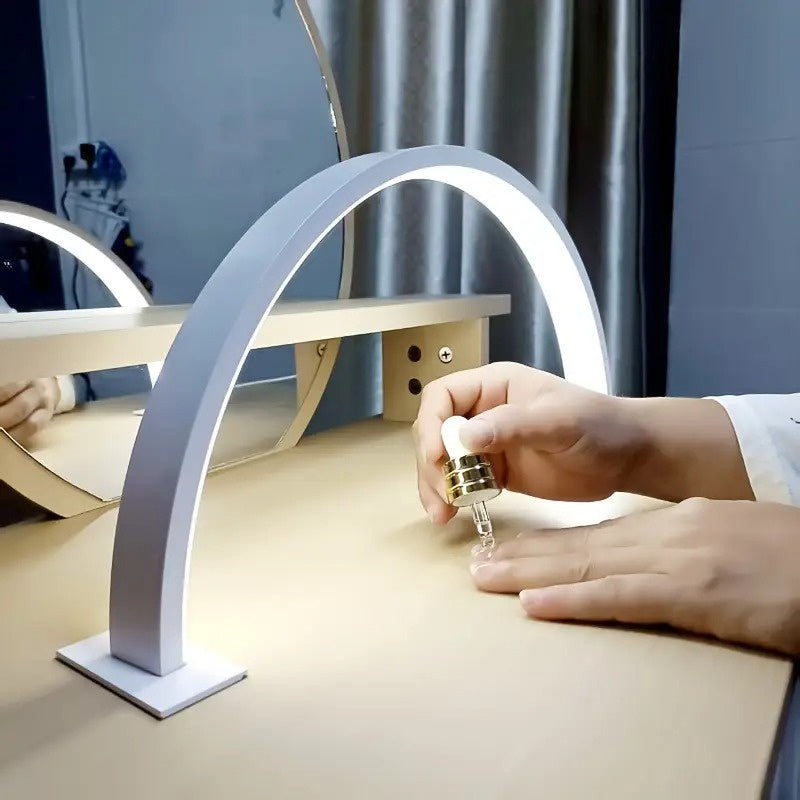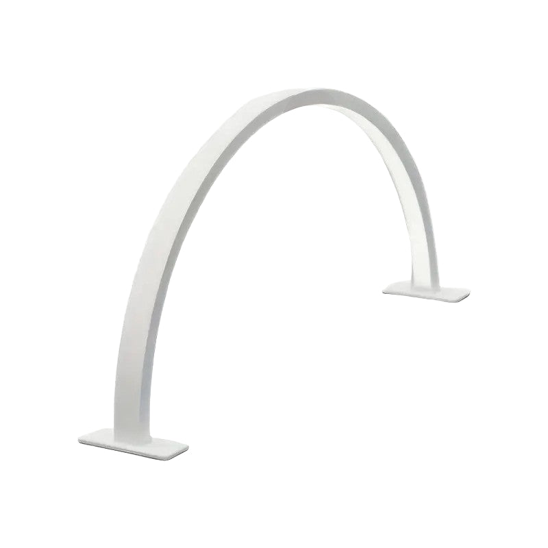 Ta łukowa lampa stołowa opiera się na dwóch płaskich, prostokątnych podstawach. Główna część lampy ma kształt łuku, a światło emitowane jest wzdłuż jej wewnętrznej krzywizny. Lampa zapewnia oświetlenie skierowane w dół z łukowej części.
