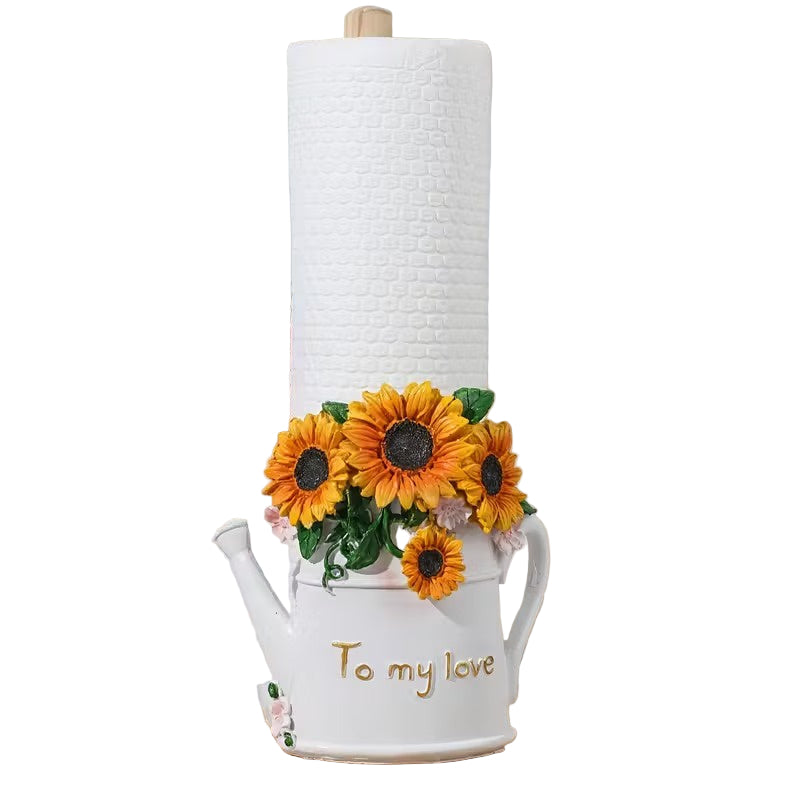 Ten kuchenny uchwyt na ręczniki papierowe ma podstawę w kształcie małej konewki. Podstawa zawiera grupę dekoracyjnych kwiatów. Pionowy pręt przykręca się do podstawy.