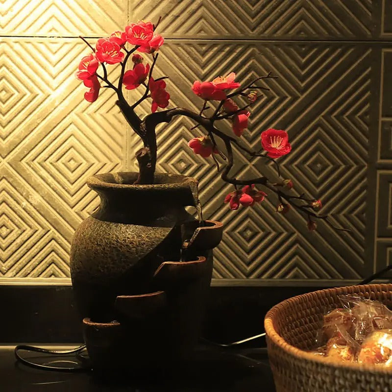 Ten produkt to dekoracyjny wazon do wnętrz wykonany z żywicy i plastiku. Charakteryzuje się płynącym wodospadem, z wodą spływającą z jednego poziomu na drugi przez małe, zakrzywione sekcje. Na szczycie wazonu znajduje się gałązka z kwiatami. Produkt przeznaczony jest do dekoracji wnętrz.