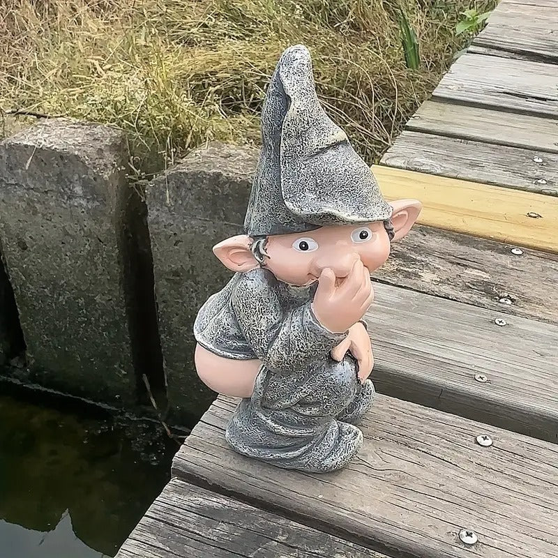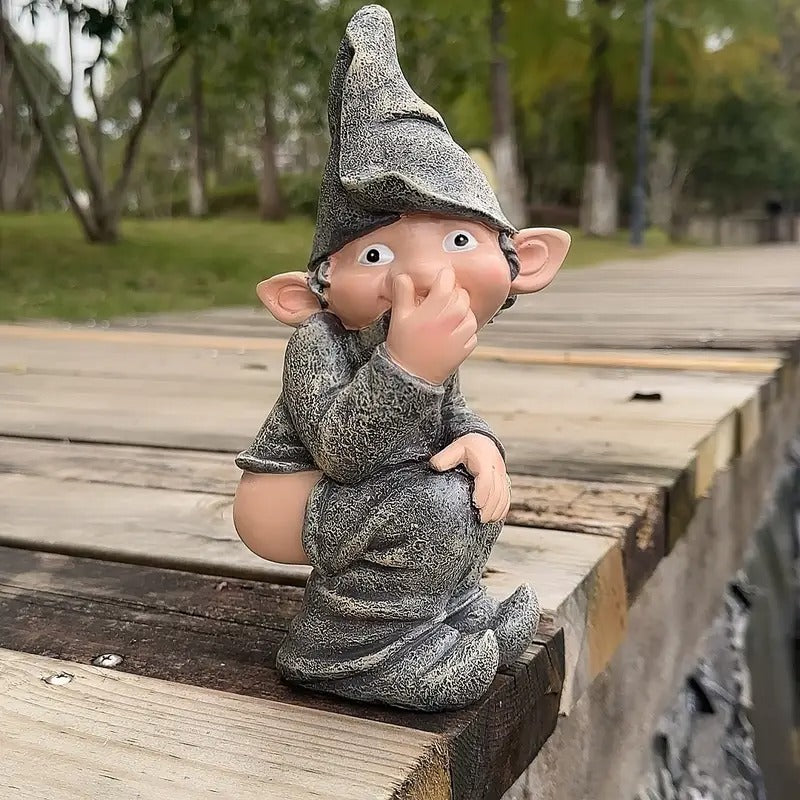 Ta dekoracja ogrodowa przedstawia figurkę krasnala w kreskówkowym stylu, przeznaczoną do ekspozycji na zewnątrz. Krasnal przedstawiony jest z palcami przyciśniętymi do nosa, tworząc figlarną pozę. Nosi spiczasty kapelusz i pasujące do niego ubranie. Wykonana z żywicy figurka nadaje się do wykorzystania w różnych przestrzeniach zewnętrznych.