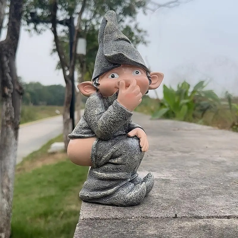 - Design i poza: Krasnal przedstawiony jest w stylu kreskówkowym z palcami przyłożonymi do nosa